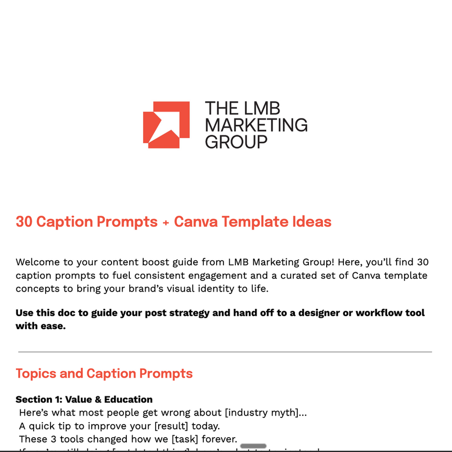 Say goodbye to content block! The “30 Caption Prompts + Canva Template Ideas” guide by The LMB Marketing Group is your shortcut to stress-free, high-engagement content creation.